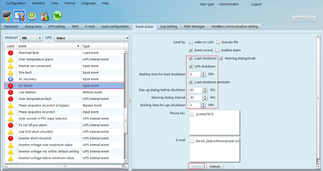 3. 轉(zhuǎn)到事件動(dòng)作頁(yè)面,然后選擇協(xié)議,UPS和事件,如圖3-1所示。例如,選擇“交流故障”事件,然后選擇發(fā)送類型,選擇負(fù)載關(guān)機(jī)、UPS關(guān)機(jī)、輸入負(fù)載關(guān)機(jī)等待時(shí)間、負(fù)載關(guān)機(jī)提醒、關(guān)機(jī)前彈出的對(duì)話框、警告對(duì)話間隔、UPS關(guān)機(jī)等待時(shí)間,然后點(diǎn)擊“應(yīng)用”按鈕,參見圖3-2。